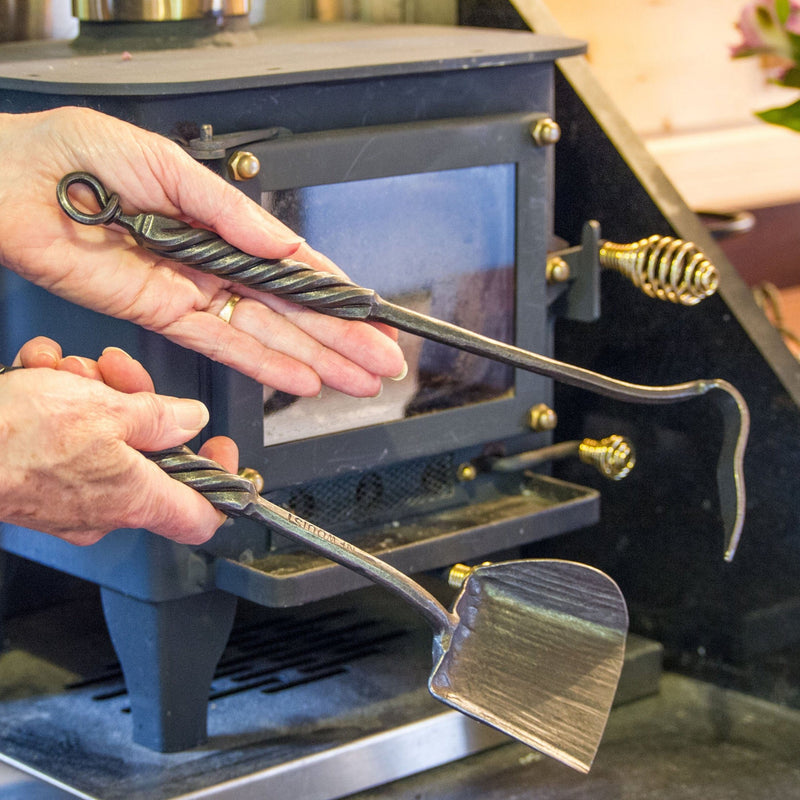 Mini hand forged fireplace tools for your tiny wood stove ! These are designed to be very functional and to store nicely when not in use. These tools are a joy to use, and look beautiful hanging on the wall beside the wood stove.