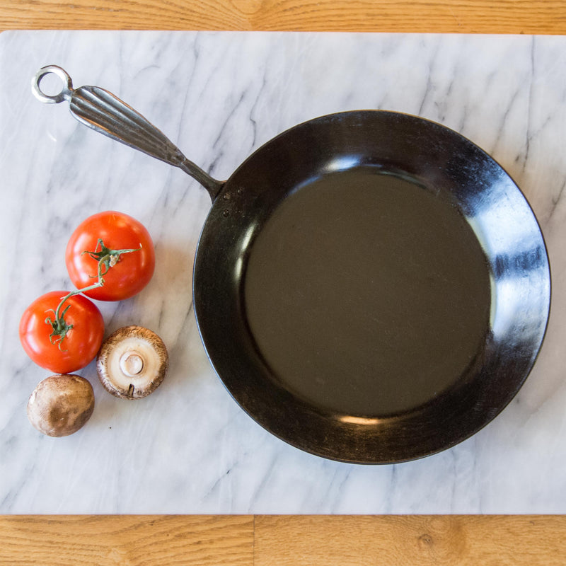 Our 11" carbon steel frying pan with flared sides is hand forged with a pre-seasoned surface. This is the next size up from our 10" fry pan, and now you can fit more volume of food for searing and sauteing, as well as cooking fish and eggs.