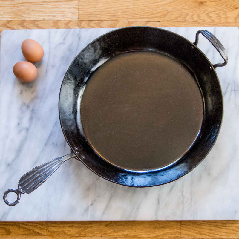 Our hand forged 13" Sauté Pan comes to you pre-seasoned, and is the largest pan in our collection. The Sauté is deeper than our fry pan, meant to hold more volume with steeper sides, and a helper handle for easy lifting. Long handle stays comfortable while cooking