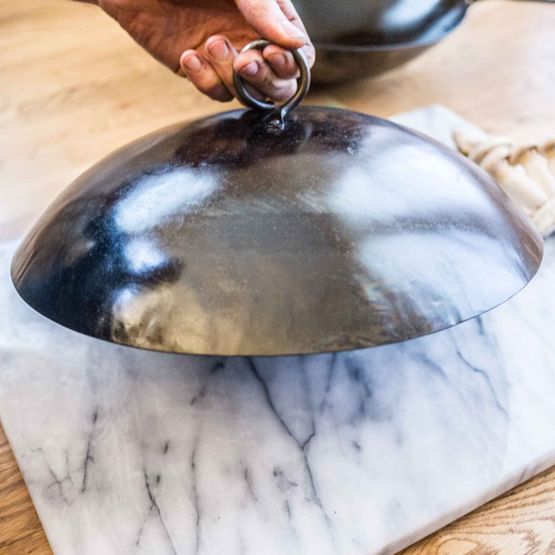 Carbon steel wok lids fitted perfectly for Newquist Forge Woks.Keep the steam in, keep the splash down! Perfect for making popcorn.